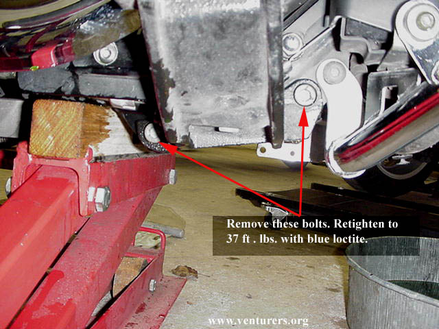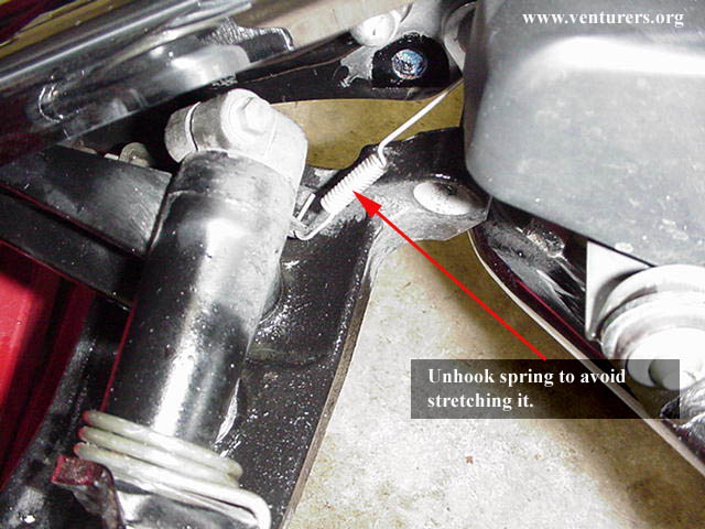 There are two hex bolts holding the floorboard on. Once these are removed I unhooked the spring that operates the rear brake light so I didn't stretch it.